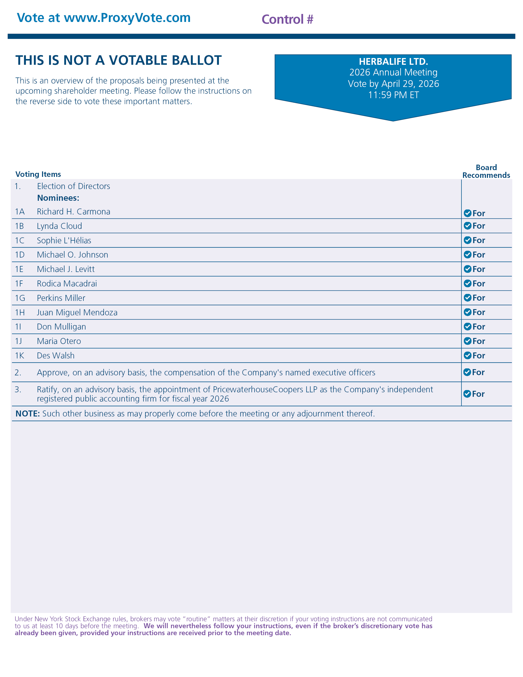 Vote at www.ProxyVote.com Control # THIS IS NOT A VOTABLE BALLOT This is an overview of the proposals being presented at the upcoming shareholder meeting. Please follow the instructions on the reverse side to vote these important matters. HERBALIFE LTD. 2026 Annual Meeting Vote by April 29, 2026 11:59 PM ET Voting Items Board Recommends 1. Election of Directors Nominees: 1A Richard H. Carmona For 1B Lynda Cloud For 1C Sophie L’Hélias For 1D Michael O. Johnson For 1E Michael J. Levitt For 1F Rodica Macadrai For 1G Perkins Miller For 1H Juan Miguel Mendoza For 1I Don Mulligan For 1J Maria Otero For 1K Des Walsh For 2. Approve, on an advisory basis, the compensation of the Company’s named executive officers For 3. Ratify, on an advisory basis, the appointment of PricewaterhouseCoopers LLP as the Company’s independent registered public accounting firm for fiscal year 2026 For NOTE: Such other business as may properly come before the meeting or any adjournment thereof. Under New York Stock Exchange rules, brokers may vote “routine” matters at their discretion if your voting instructions are not communicated to us at least 10 days before the meeting. We will nevertheless follow your instructions, even if the broker’s discretionary vote has already been given, provided your instructions are received prior to the meeting date.